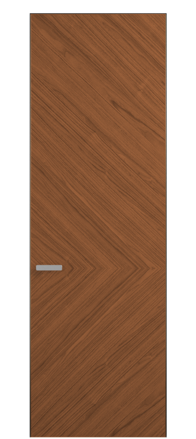 Полотно Рифт в скрытом алюминиевом коробе становится полноценным элементом декора. В коллекции представлено 9 моделей дверей в высоте до 3 метров. Рисунок раскладки шпона варьируется от простого до сложного. «Рубашка» для каждого полотна подбирается вручную по цвету, текстуре и фактуре.